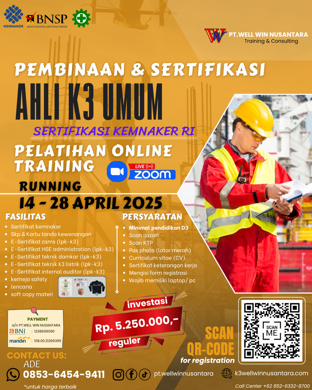Tingkatkan kompetensi Anda dengan Sertifikasi Ahli K3 Umum yang diakui oleh Kemnaker RI. Pelatihan online via Zoom Cloud ini dipandu oleh instruktur profesional dan berpengalaman.