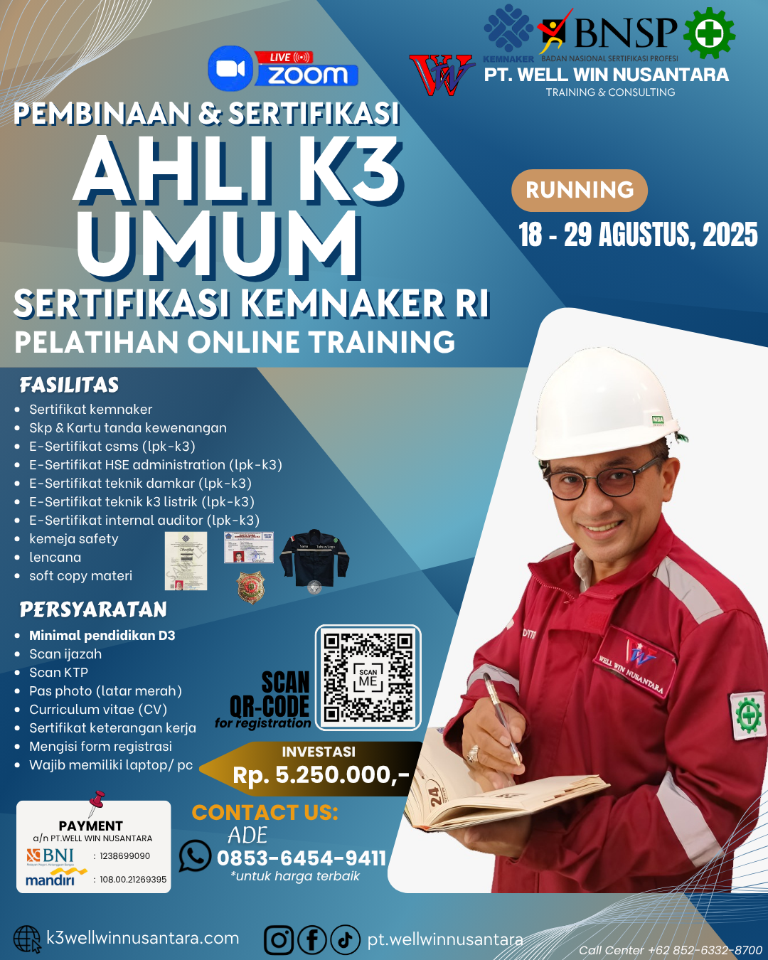 PT. Well Win Nusantara kembali membuka Pelatihan dan Sertifikasi Ahli K3 Umum (AK3U) secara online via Zoom yang akan dilaksanakan pada 18–29 Agustus 2025. Kesempatan emas ini terbuka untuk para profesional yang ingin meningkatkan kompetensi di bidang K3 (Keselamatan dan Kesehatan Kerja) dan meraih sertifikat resmi dari Kemnaker RI.