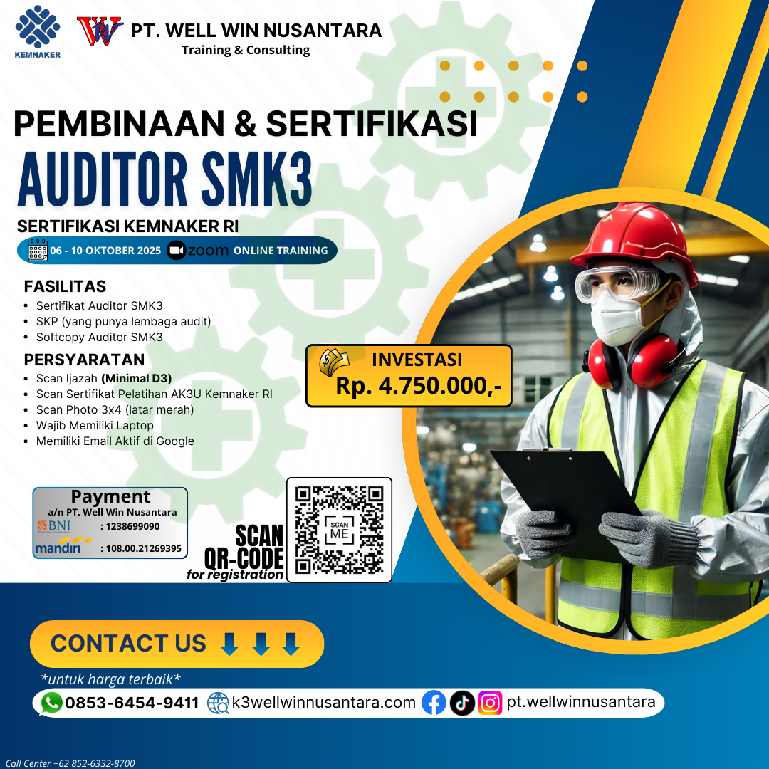 Ikuti Pelatihan & Sertifikasi Auditor SMK3 bersama PT. Well Win Nusantara.